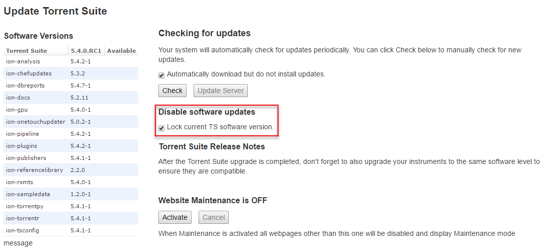 An administrator can prevent other users from installing updates to Torrent Suite™ Software. Use this procedure to lock the current version of software and to prevent accidental software updates.